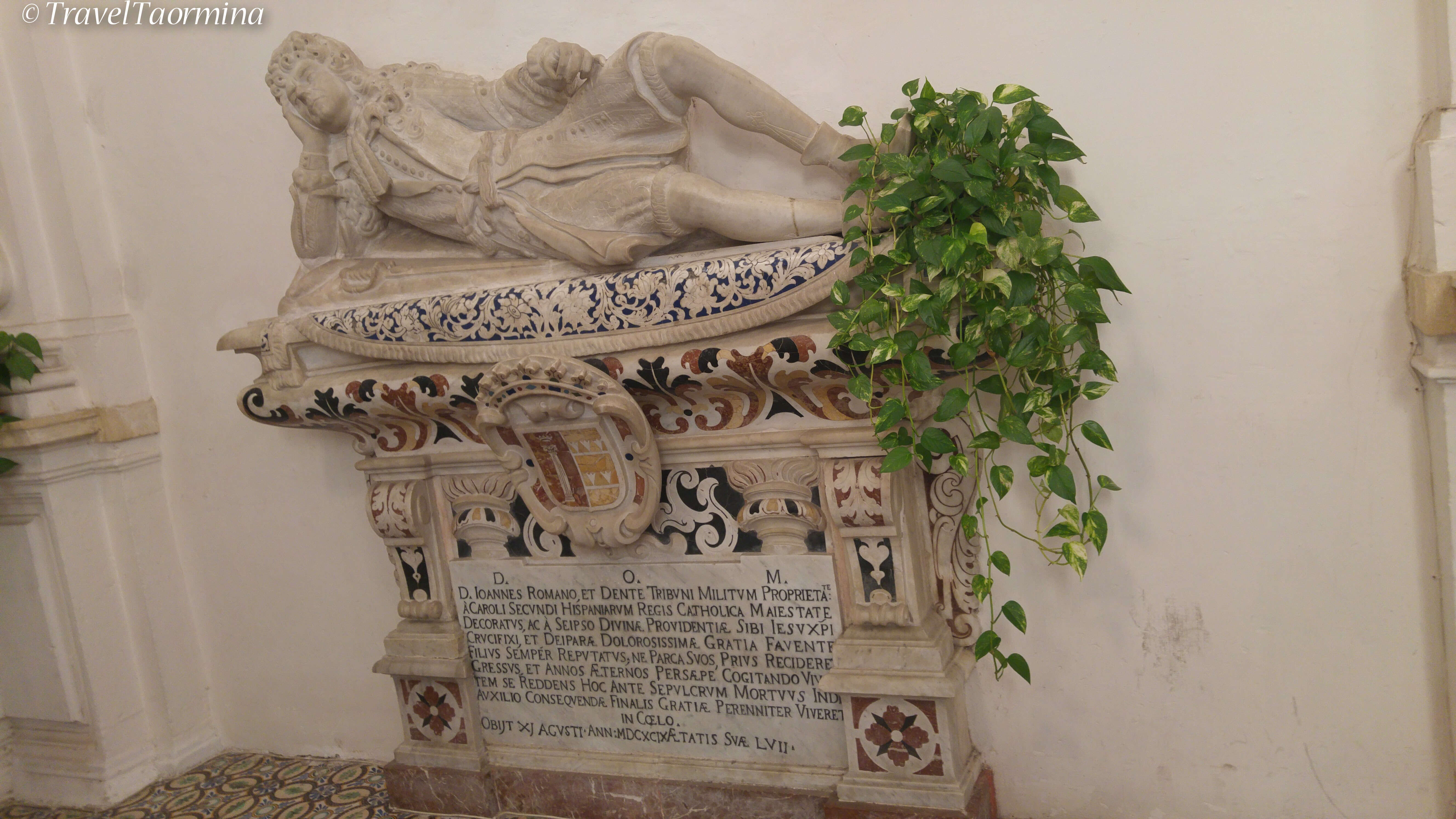 To the right of the main altar is the tomb of the Count Giovanni Romano Denti with the sleeping statue of Count, with the plaque that bears the following text: "DOMD Johannes Romano et Tooth tribunes militum Proprietate to Caroli regis Seconds Hispaniarum Catholic maiestate decoratus, ac seispo divinae Providentiae sibi Jesuxpi crucifixi, et Deiparae Dolorosissimae gratia favente filius always reputatus, it frugal suos prius recideret grssus et annos aeternos persaepe musing viventem if reddens hoc ante sepulcrum mortuus inde auxilio consequende finalis gratiae perenniter Viveret in coelo. Objit XI Agusti Ann . MDCXCIX Aetatis suae LVII. "
