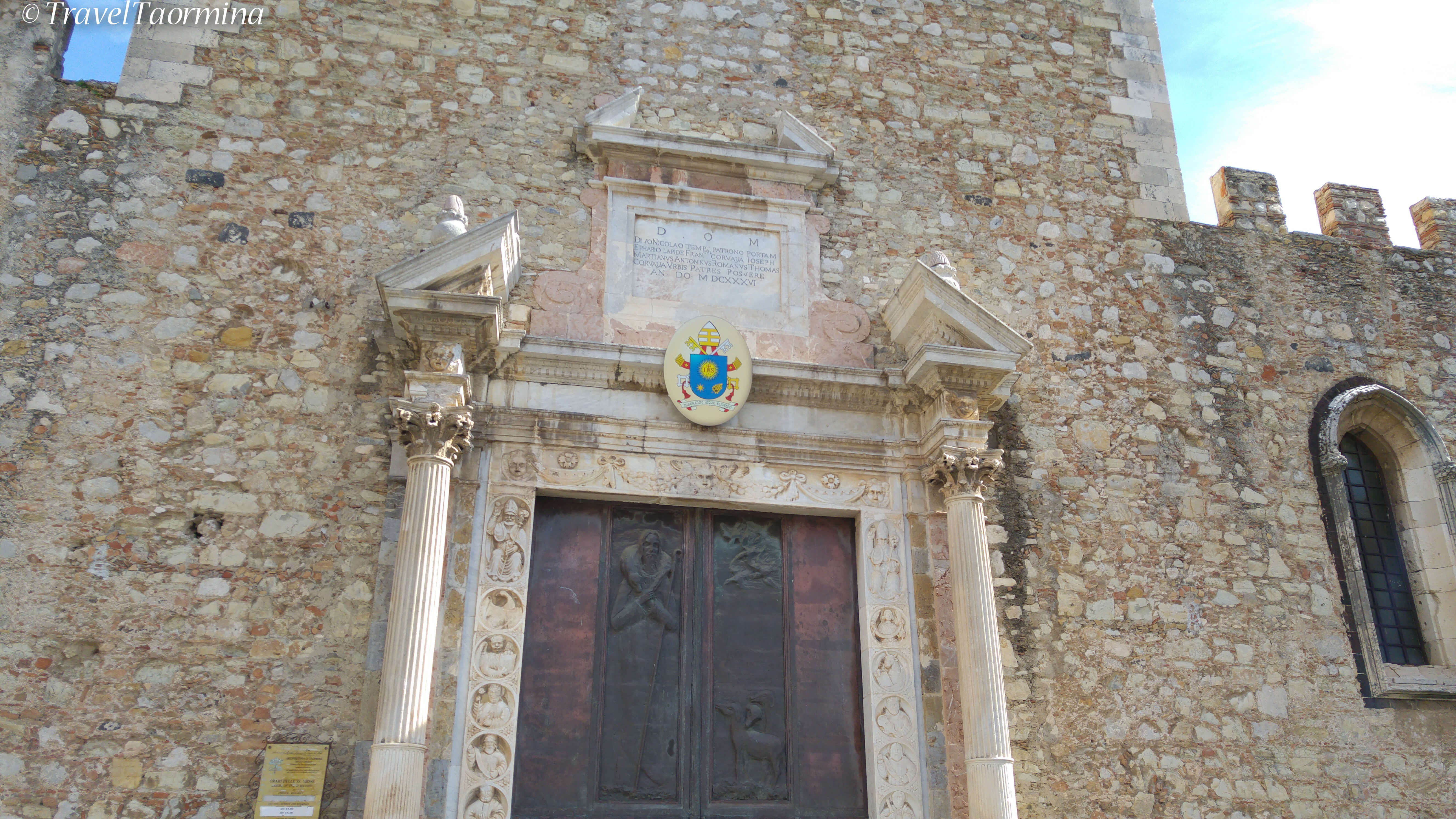 On the main facade, between two fifteenth-century ogival windows, we find the beautiful main door, which was rebuilt in 1636, by decision of the local administrator of the time, as it is shown on the slab of marble above the door. At each side of the main entrance there are two fluted columns in Corinthian style rising from high bases, and over the lintel there is a broken pediment; above the capitals of columns glimpsed the faces of two angels. Each doorjamb bears eleven carved figures These twenty-two characters represent St. Peter (keys of paradise), St. Paul (the sword of the Faith) King David (cither), the four evangelists in their characteristic symbols: the lion (Saint Mark), the eagle (St John), Taurus ( St Luke) and angel (St Matthew). The identification of other saints and apostles is not always so simple and obvious. At the top of each side of the marble frame there are two blessing bishops with mitre and pastoral. They are Saint Nicholas, the Titular Saint of the church and Saint Pancras, Taormina’s Patron Saint.