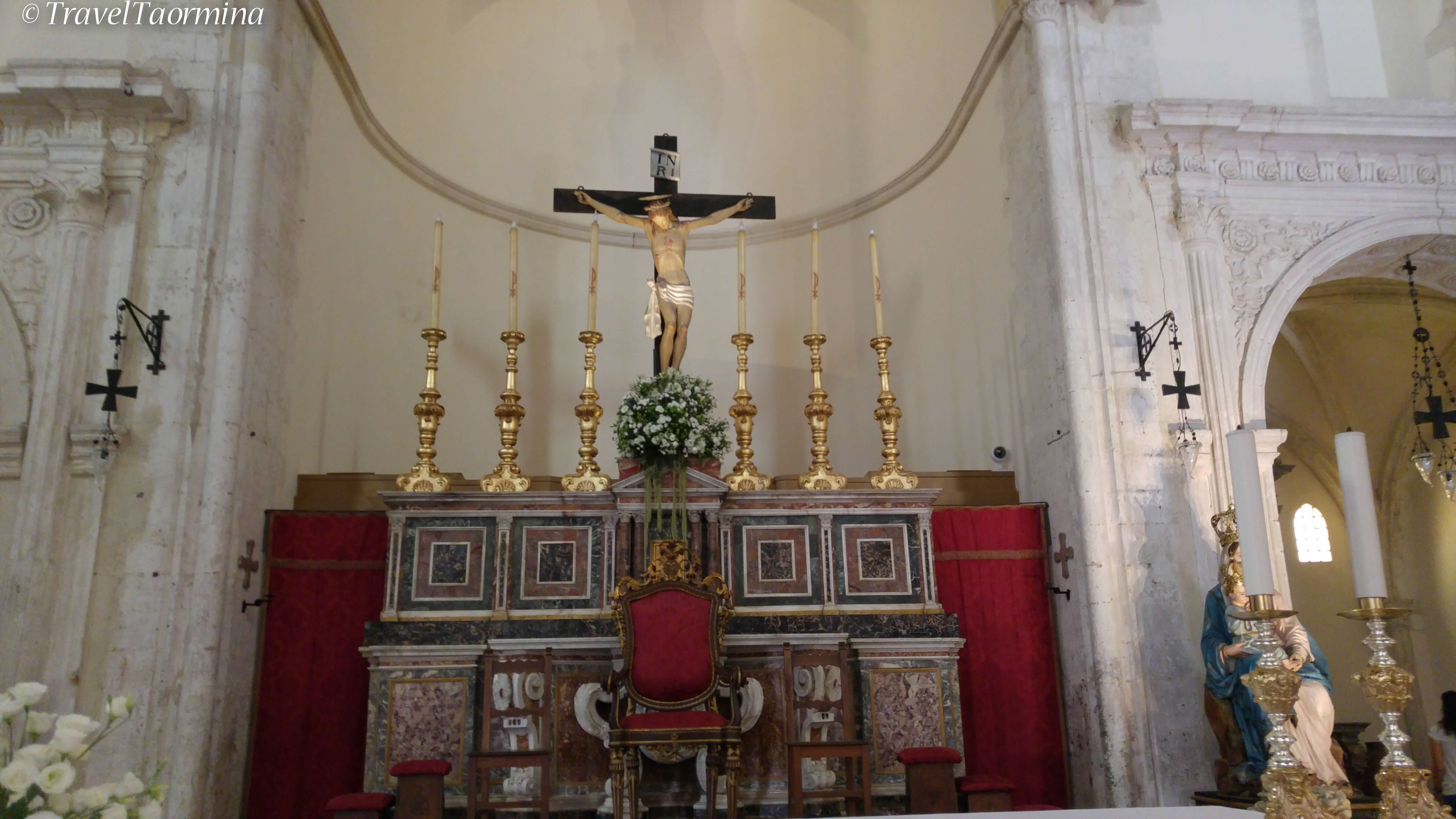 At each side of the main altar are two chapels worthwhile seeing:: on the left, the chapel of the Holy Sacrament, the end of '600, is in the Baroque style; on the right, one of Our Lady of Graces, was instead rebuilt in 1747 reusing the materials of a demolished Gothic chapel of St. Peter’s in Taormina.